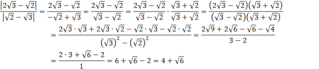 Na początku tego zadania musisz skorzystać z tego, że wartość bezwzględna ilorazu to iloraz wartości bezwzględnych. W kolejnym kroku musisz zamienić wszystkie liczby w wartości bezwzględnej na pierwiastki i sprawdzić czy ich różnica jest większa lub mniejsza od 0 (musisz porównać liczby pod pierwiastkami). Jeśli liczba w wartości bezwzględnej jest większa bądź równa 0 to po zdjęciu modułu wystarczy przepisać tę liczbę. Jeśli liczba w wartości bezwzględnej jest mniejsza od 0 to po zdjęciu modułu musisz zmienić wszystkie znaki pod modułem na przeciwne. Aby pozbyć się niewymierności musisz przemnożyć licznik i mianownik przez mianownik ze przeciwnym znakiem między liczbami. W liczniku musisz przemnożyć nawiasy przez siebie, a w mianownik ze wzoru na różnicę kwadratów a2 – b2 = (a – b)(a + b).