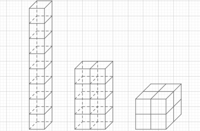 W tym zadaniu musisz zbudować z 8 sześcianów podanych wymiarach różne prostopadłościany, a następnie obliczyć ich powierzchnie.