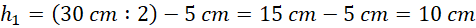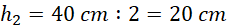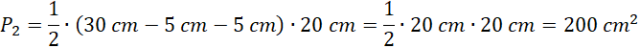 Oblicz wysokości szarych trójkątów – pierwszego dzieląc bok prostokąta na 2 i odejmując 5 cm (które stanowi niebieskie szkło), drugiego – dzieląc drugi z boków prostokąta przez 2. Oblicz pola trójkątów ze wzoru