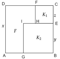 Oblicz bok kwadratu K2. Zauważ, że jest on różnicą długości boku kwadratu ABCD i K1.