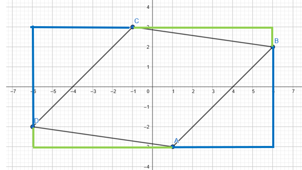 Proste AD i BC oraz AB i CD zbudowane są na takich samych trójkątach prostokątnych (rysunek – niebieskie i fioletowe), więc są do siebie równoległe.