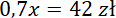 Cenę spódnicy obniżono o 30% i teraz trzeba za nią zapłacić 42 zł. Ile kosztowała spódnica przed obniżką? Oznacz tę cenę jako x. Aktualna cena po obniżce o 30% to 0,7x: