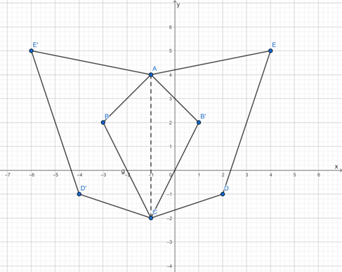 A’ = A = (-1, 4), B’ = (1, 2), C’ = C = (-1, -2), D’ = (-4, -1), E’ = (-6, 5)