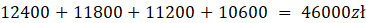 Kredyt zaciągnięty przez Pana Artura na kwotę 40000zł jest oprocentowany na 6 % w skali roku i będzie spłacany przez cztery lata. Każda rata będzie płacona na koniec roku i składa się z części kapitałowej równej 10000zł oraz odsetek naliczonych za ostatni rok od części kredytu, która nie została spłacona. W tabeli podano harmonogram spłat kredytu: