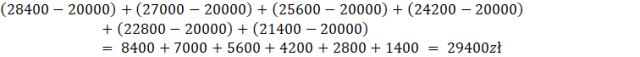 Tworzymy tabelę według wzoru podanego w przykładzie. Następnie oblicz odsetki odejmując od raty stałą kwotę 20000zł. Na końcu dodaj je wszystkie do siebie i oblicz łączną kwotę zapłaconych odsetek.
