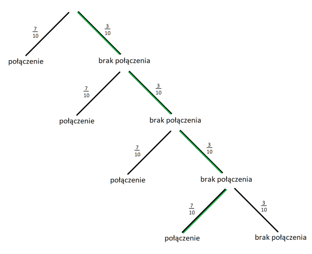 Opisane doświadczenie losowe jest wieloetapowe, wobec czego możesz narysować drzewko. Każdy poziom drzewka będzie odpowiadał kolejnym próbom dodzwonienia się. Ponieważ niedodzwonienie się jest zdarzeniem przeciwnym do dodzwonienia. Więc prawdopodobieństwo nieuzyskania połączenia wynosi 100% – 70% = 30%. Prawdopodobieństwa zapisane jako procenty musisz zamienić na ułamki. Gdy już narysujesz drzewo zaznacz te zdarzenia, których prawdopodobieństwo będziesz liczył oraz wszystkie gałęzie po drodze. Następnie przemnóż przez siebie prawdopodobieństwa na poszczególnych gałęziach.
