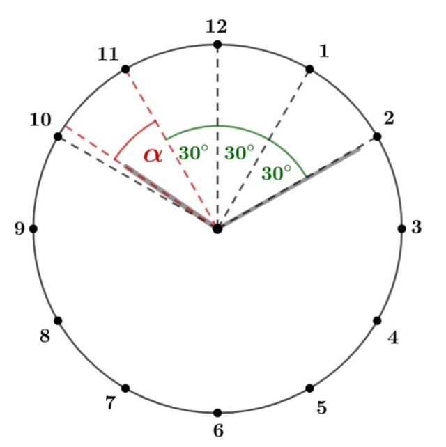 Aby rozwiązać to zadanie wykonaj rysunek pomocniczy biorąc pod uwagę odpowiednie miary kątów, które tworzą wskazówki pokazujące wskazane godziny.