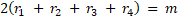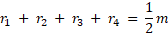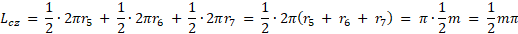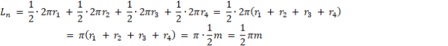 Linia ma długość m. Suma długości promieni czterech półokręgów tworzących niebieską linię jest równa połowie długości m. Suma długości promieni trzech półokręgów tworzących czerwoną linię jest równa połowie długości m. Te dwie linie są sobie równe.