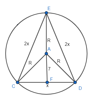 Odległość środka okręgu opisanego na trójkącie równoramiennym od prostej, która zawiera podstawę tego trójkąta, wynosi 7 cm. Oblicz pole tego trójkąta, wiedząc, że długość jednego ramienia jest dwukrotnie dłuższa od podstawy.