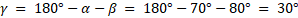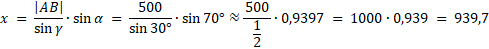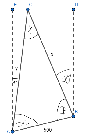 Dwóch obserwatorów znajduje się w punktach A i B, które są oddalone od siebie o 500 m (zgodnie z rysunkiem). Obserwator A raportuje, że punkt C jest odchylony o 10°, a punkt B o 80° na wschód od kierunku północnego. Obserwator B stwierdza, że punkt C jest odchylony o 20° na zachód od kierunku północnego. Oblicz odległość każdego z obserwatorów od punktu C, z dokładnością do 0,1 m.