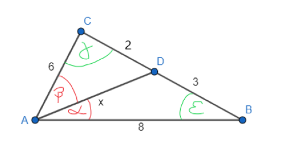 W trójkącie ABC, gdzie długość boku AB wynosi 8, długość boku AC wynosi 6, na boku BC wybrano punkt D o długościach BD równemu 3 i CD równemu 2. Oblicz miary kątów CAD i BAD.