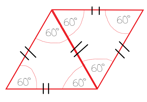 . Jeśli poprowadzimy przekątną to podzieli ona romb na dwa trójkąty równoboczne – każdy z boków będzie miał identyczną długość, czyli długość jednej z przekątnych tego rombu jest taka sama jak długość jego boku.