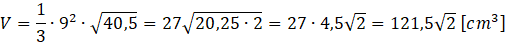 W ostrosłupie prawidłowym czworokątnym suma długości wszystkich krawędzi podstawy jest równa sumie długości wszystkich krawędzi bocznych i wynosi 36 cm. Oblicz objętość tej bryły.