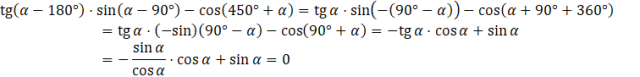 Wykaż, że tg (α - 180°) ⋅ sin (α - 90°) – cos (450° + α) wynosi tyle samo dla wszystkich kątów α, których miara nie wynosi 90° + k ⋅ 180°.