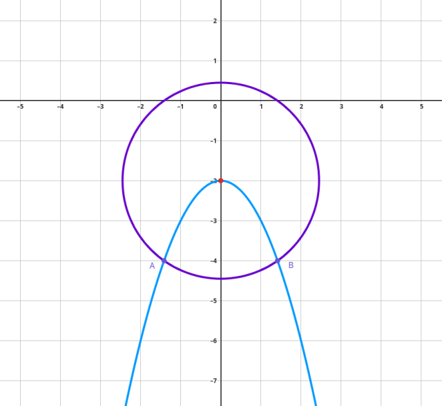 Ułóż układ równań z równania okręgu oraz paraboli. Wstaw równanie paraboli do równania okręgu. Znajdź miejsca zerowe powstałego w ten sposób równania dwukwadratowego, podstawiając