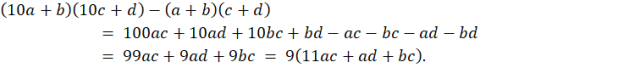 Przedstaw dowód, że dla dwóch dowolnych liczb dwucyfrowych prawdziwe jest stwierdzenie: iloczyn tych liczb pomniejszony o iloczyn sum ich cyfr jest podzielny przez 9.