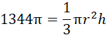 Dany jest pewien stożek o objętości 1344π cm3 utworzony poprzez obrót trójkąta prostokątnego wokół krótszej przyprostokątnej. Oblicz pole powierzchni całkowitej stożka wiedząc, że sinus kąta ostrego trójkąta prostokątnego jest równy 0,96.