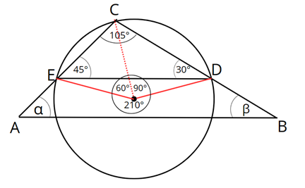 Zauważ, że trójkąt CDO, gdzie O to środek okręgu, jest prostokątny. Wyznacz długość odcinka CE z twierdzenia sinusów. Zauważ, że stosunek odcinków