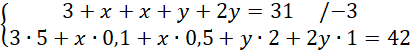 Ustal, ile jest monet każdego rodzaju, jeśli Tomek ma w skarbonce trzydzieści jeden monet w tym: trzy monety 5-złotowe, monety 1- i 2-złotowe oraz monety 10- i 50-groszowe, liczba monet 10-groszowych jest taka sama jak liczba monet 50-groszowych, a monet 1-złotowych jest dwukrotnie więcej niż monet 2-złotowych, zaś suma pieniędzy w skarbonce wynosi 42 zł.
