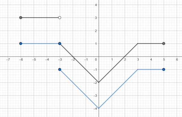 Wyznacz zdanie prawdziwe. Na rysunku przedstawiono wykres funkcji określonej w zbiorze . Funkcja jest określona wzorem dla . A.Liczba jest równa -2. jest równa -2.B.Zbiory wartości funkcji i i są równe. są równe.C.Funkcje i i mają te same miejsca zerowe. mają te same miejsca zerowe.D.Punkt należy do wykresów funkcji należy do wykresów funkcji i i ..