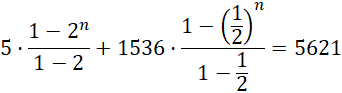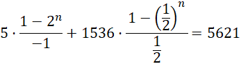 Suma wszystkich wyrazów pewnych dwóch ciągów wynosi 5621. Dwa początkowe wyrazy pierwszego z nich to 5 oraz 10, a drugiego – 1536 i 768. Oblicz, z ilu wyrazów składają się te ciągi.