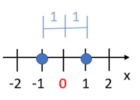 Równanie |x| = 1, możemy zapisać również, jako |x–0| = 1. Wyrażenie |x–0| oznacza odległość szukanej liczby x od liczby 0. Zaznaczamy liczbę 0 na osi liczbowej i szukamy wszystkich liczb x, których odległość od liczby 0 jest równa 1. Szukane liczby to–1 i 1 (sprawdź, podstawiając je do równania w miejsce x). Zatem: |x| = 1 ⇔ (x = –1 v x = 1), czyli x ⋲ {–1, 1}.