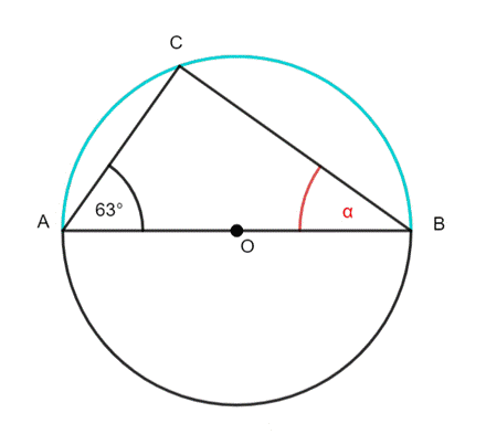 W tym zadaniu skorzystaj z twierdzenia o kątach wpisanym i środkowym, opartych na tym samym łuku, z twierdzenia o kątach wpisanych na tym samym łuku i z definicji kąta wpisanego, który jest oparty na półokręgu. Kolorem niebieskim został oznaczony łuk, na którym te kąty są wpisane. Skorzystaj również z definicji o sumie miar kątów w trójkącie.