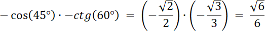 cos 225° ⋅ tg 150° = cos(180° + 45°) ⋅ tg(90° + 60°) = –cos(45°) ⋅[–ctg(60°)]