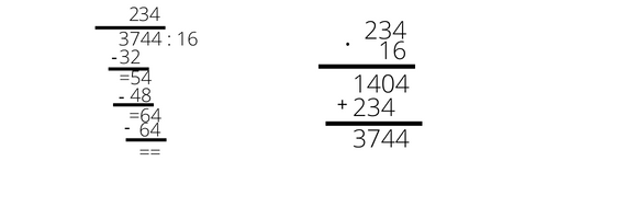 W pierwszej kolejności musisz wykonać działanie 3744 : 16 = 234. Następnie otrzymany wynik sprawdzić za pomocą mnożenie, czyli wykonać 234 ∙ 16 = 3744.