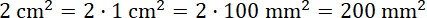 Zauważ, 2 cm2 to dwa razy po 1 cm2, więc możesz zamienić 1 cm2 na mm2 (1 cm2 to 100 mm2, bo 1 cm to 10 mm), a otrzymany wynik pomnożyć przez liczbę 2.