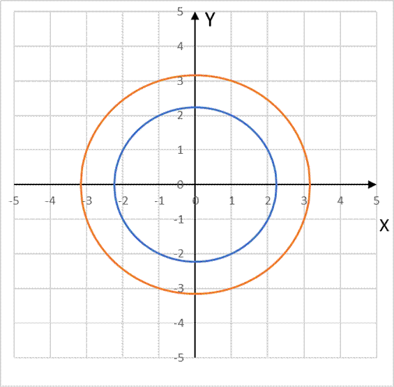 K1: x2 + y2 = 5, K2: x2 + y2 = 10