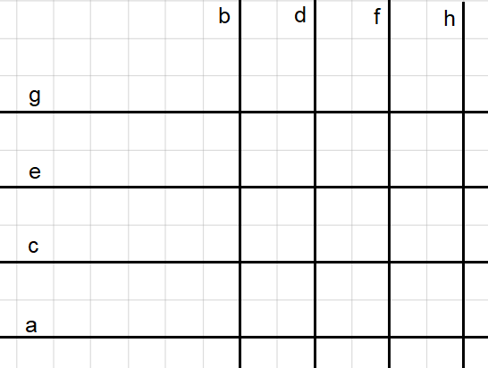 Narysuj proste. Każda następne musi być poprowadzona pod kątem prostym do poprzedniej. Co druga prosta będzie równoległa. Oblicz ilość prostopadłych (prostych przecinających się pod kątem prostym) i równoległych (bez wspólnych punktów przecięcia) do ostatniej prostej h.