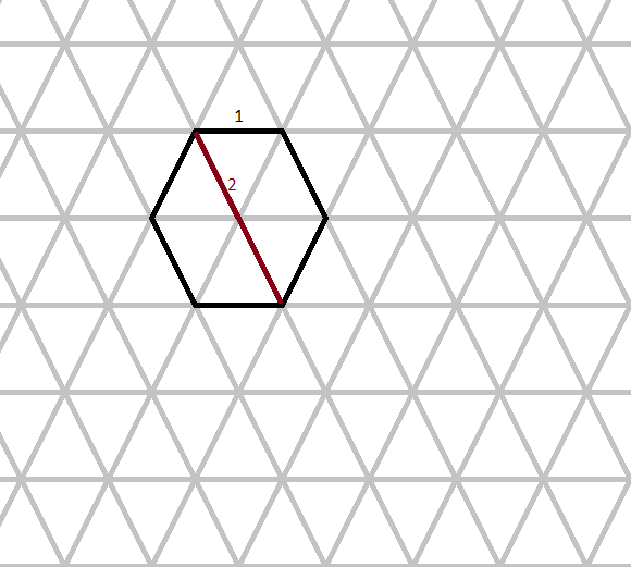 Sześciokąt foremny o boku 1 składa się z 6 trójkątów równobocznych o boku 1. Jego najdłuższa przekątna przechodzi przed środek sześciokąta i ma długość 2.