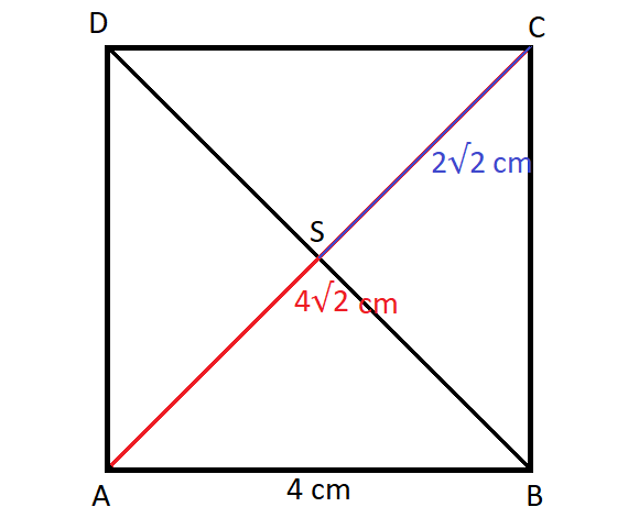 Wiemy, że bok kwadratu ma 4 cm z treści zadania. Przekątna kwadratu o boku a ma długość , więc przekątna tego kwadratu – AC ma długość cm, a jej połowa – SC ma długość cm.