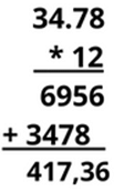 Ułamki dziesiętne mnożymy pisemnie przez liczby naturalne tak, jak mnożylibyśmy liczby naturalne, a dopiero w wyniku oddzielamy przecinkiem tyle miejsc, ile ich było w liczbie dziesiętnej.