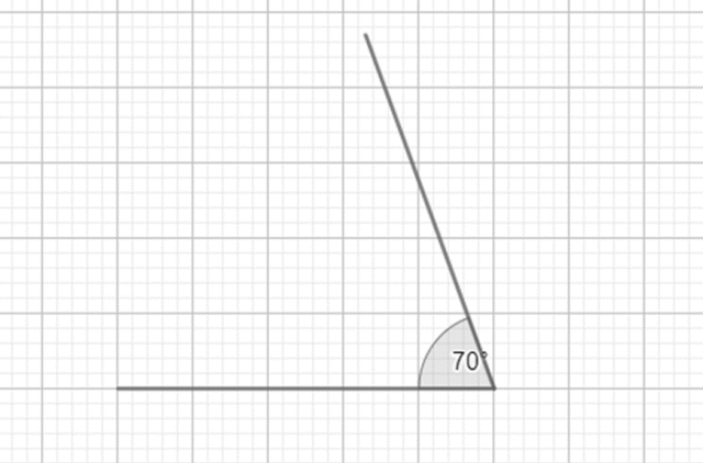 Pamiętaj, kąt prosty to kąt o mierze 90 stopni. Wykonaj odejmowanie i nazwij otrzymany kąt. Kąt, który ma więcej niż 0 stopni i mniej niż 90 stopni to kąt ostry. Narysuj ten kąt: zacznij od jednego ramienia, do jego końca przyłóż środek kątomierza i odszukaj na podziałce 70 stopni. Zaznacz delikatnie to miejsce, odsuń przyrząd i połącz punkcik z końcem ramienia. Zaznacz łuk.