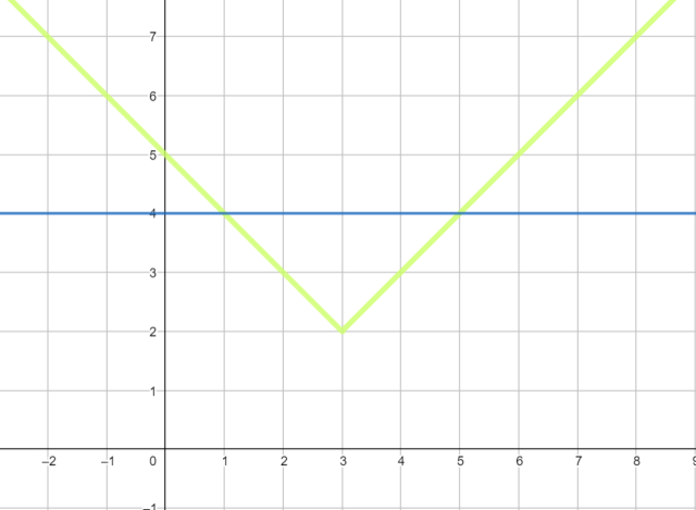 Naszkicuj wykresy funkcji y = ||x – 3| + 2| – kolor zielony oraz y = 4 – kolor niebieski. Rozwiązaniami są te argumenty, dla których wykres zielony znajduje się ponad niebieskim lub wykresy się przecinają.