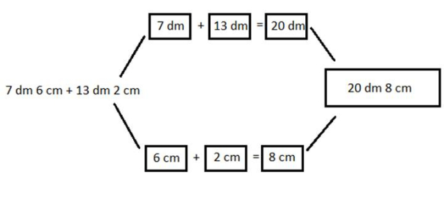 W tym zadaniu musisz uzupełnić schemat i wykonać obliczenie sumy: 7 dm 6 cm + 13 dm 2 cm.
