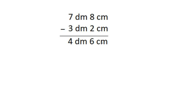 W tym zadaniu musisz wykonać odejmowanie podanego działania: 7 dm 8 cm - 3 dm 2 cm.