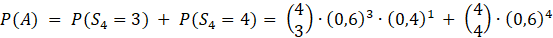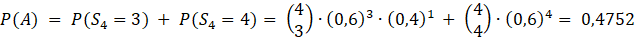 Zdarzenie A można rozłożyć na dwa zdarzenia: strzelec trafił 3 razy i strzelec trafił 4 razy. Oblicz prawdopodobieństwa i dodaj je: