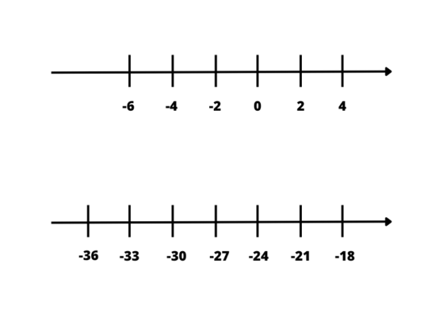 W tym zadaniu musisz zaznaczyć na osiach liczbowych brakujące wartości, pamiętając, że w przypadku pierwszej osi wartości rosną o wartość 2, a w przypadku drugiego wykresu, o wartość 3.