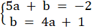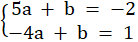 Skorzystaj ze wzoru na szukaną funkcję i podstaw współrzędne punktów danych w zadaniu (5, -2) oraz (-4, 1). Utwórz układ równań i wylicz z niego wartości a i b.