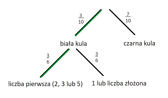 Ponieważ doświadczenie losowe jest wieloetapowe, w tym zadaniu musisz narysować drzewko. Pierwszy poziom drzewka będzie odpowiadał losowaniu kuli, zaś drugi – rzutowi kostką. Możesz wylosować kulę białą lub czarną, zaś rzucając kostką sześcienną możesz wyrzucić trzy liczby pierwsze (2, 3 lub 5), albo pozostałe liczby i te przypadki zaznaczasz jako gałęzie. Zarówno prawdopodobieństwo wylosowania danej kuli jaki i wyrzucenia danej liczby oczek obliczasz z klasycznej definicji prawdopodobieństwa dzieląc ilość konkretnych kul lub liczb na kostce przez wszystkie kule bądź liczby jakie są. Ponieważ w tym zdarzeniu interesuje cię wyrzucenie białej kuli, to nie musisz rozrysowywać gałęzi wychodzących od kuli czarnej. Gdy już narysujesz drzewo zaznacz te zdarzenia, których prawdopodobieństwo będziesz liczył oraz wszystkie gałęzie po drodze. Następnie przemnóż przez siebie prawdopodobieństwa na poszczególnych gałęziach.