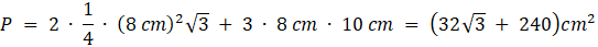 Pole powierzchni graniastosłupa to suma pola dwóch podstaw, które są figurami przystającymi oraz jego ścian bocznych, które już nie muszą być równe. W graniastosłupie prawidłowym trójkątnym w podstawie znajduje się trójkąt równoboczny, a ściany boczne są przystającymi prostokątami, zatem: