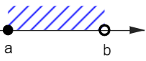 Przedział jest ograniczony od lewej strony, więc jest to przedział lewostronnie domknięty. Liczba x musi być większa lub równa a oraz mniejsza od b, żeby należeć do zbioru. Na osi liczbowej przedział zamknięty zaznacz wypełnionym kółkiem, a przedział otwarty kółkiem niewypełnionym.