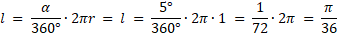 Oblicz długość łuku wyznaczonego na okręgu o promieniu 1 przez kąt środkowy o mierze 5°.