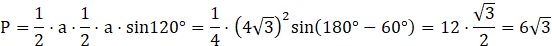 Obwód trójkąta równoramiennego o podstawie a i ramieniu b ma wzór Obw = 2b + a. Wyznaczamy jeden bok przy pomocy drugiego korzystając z własności funkcji trygonometrycznych dla kąta ostrego trójkąta ACD. Gdy mamy podany kąt między dwoma bokami trójkąta, to jego pole jest równe w połowie iloczynowi długości tych boków i sinusa kąta zawartego między nimi,