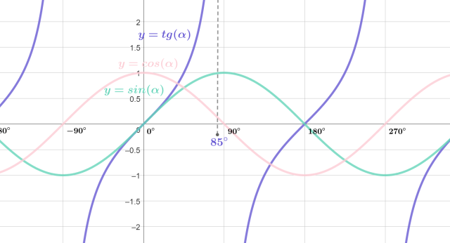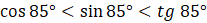 Dane są wyrażenia: sin 85°, cos 85° oraz tg 85°. Uporządkuj ich wartości rosnąco. W tym celu skorzystaj z sinusoidy, cosinusoidy i tangensoidy.