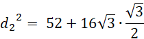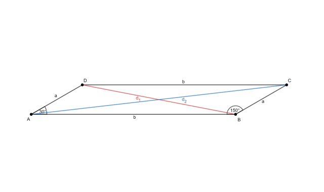 Skorzystaj z własności kątów w równoległoboku, by obliczyć miarę kąta lezącego naprzeciwko drugiej przekątnej – d2