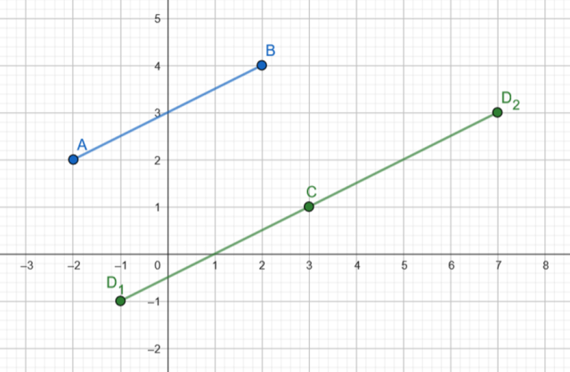 Oznacza to, że aby otrzymać odcinek CD będący równoległy do odcinka AB i mający tę samą długość należy pokonać taką samą ”drogę”. Na tej podstawie zapisz możliwe współrzędne szukanego punktu D.